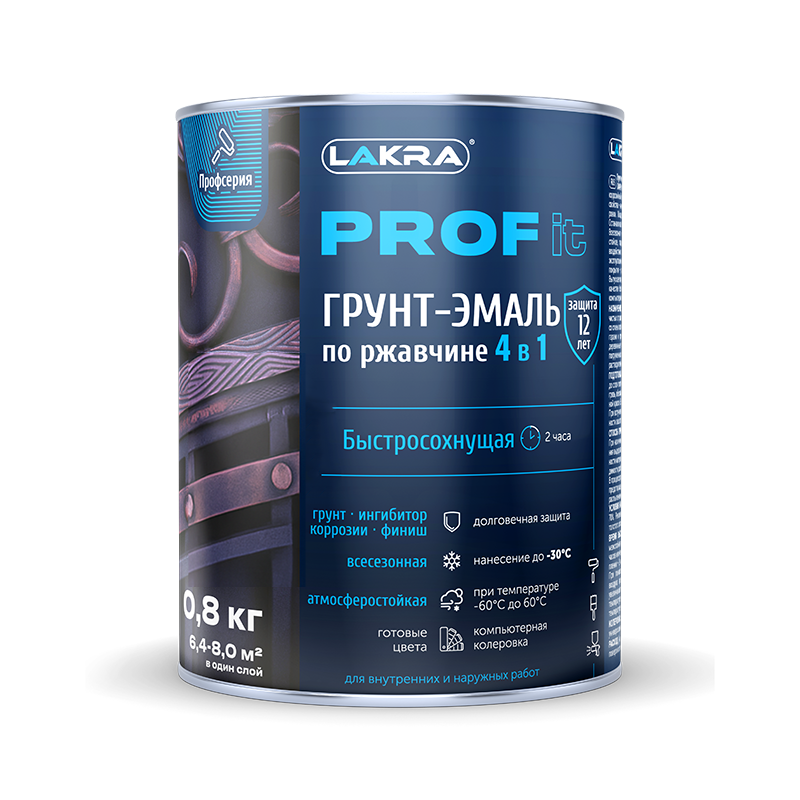 Быстросохнущая, всесезонная (-30°С), гладкая. Атмосферостойкая гладкая грунт-эмаль «4 в 1», сочетающая в себе свойства преобразователя ржавчины, антикоррозионного грунта, декоративной эмали, а также обладающая передовыми потребительскими свойствами – нанесение до -30°С, быстрое время высыхания и возможность колеровки. Прогнозируемый срок службы покрытия при условии соблюдения технологии нанесения – более 12 лет.